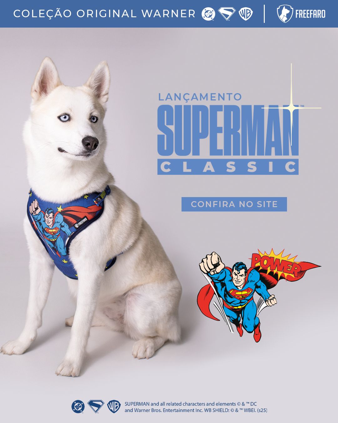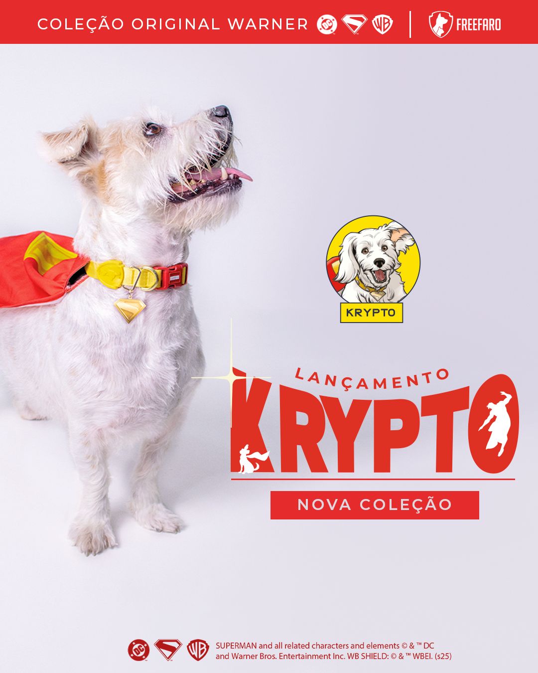PT - Superman & Krypto (Warner Bros. x FreeFaro) Desenvolvimento das estampas licenciadas do Superman e Krypto, incluindo o design exclusivo das capas temáticas. Este projeto foi um trabalho colaborativo entre mim e minha equipe de marketing, abrangendo desde a criação do produto até a estratégia da campanha. O grande destaque foi o uso das capas em um evento oficial de ativação, onde os produtos que desenhei vestiram os cães ao lado do ator principal e do diretor do filme Superman. Nota: A Warner Bros. disponibiliza os assets gráficos/guia de estilo; a composição final da estampa e o design do produto são de autoria do designer.